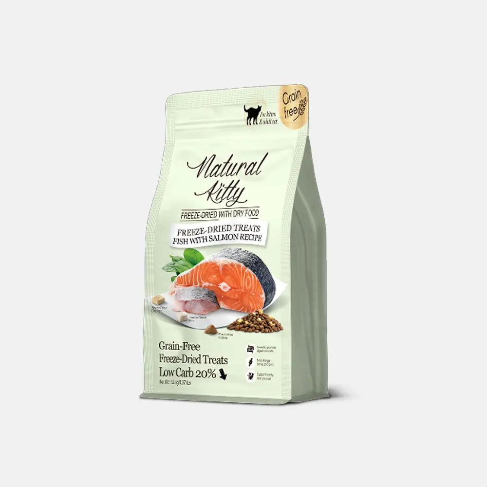 The NATURAL KITTY freeze-dried food range offers an exceptionally tasty recipe, containing real pieces of fish and freeze-dried salmon, mixed with dry food in a single pack to give your cat an irresistible meal.
